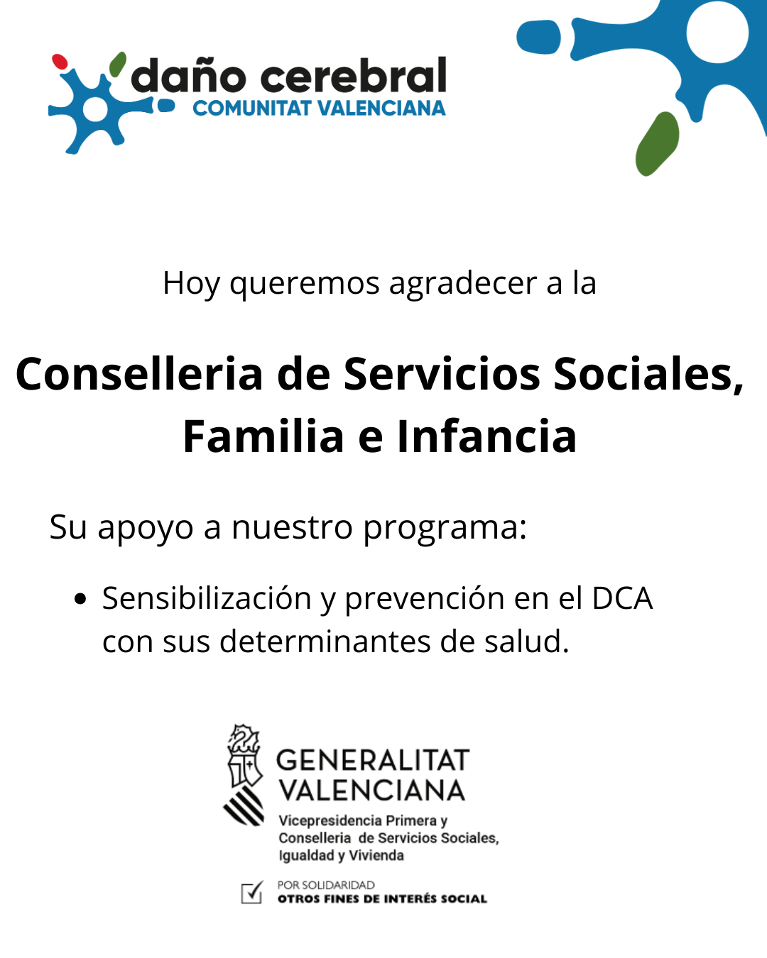Hoy queremos agradecer a la Conselleria de Servicios Sociales, Familia e Infancia por su apoyo a nuestro programa “Sensibilización y prevención en el DCA y sus determinantes de salud”. Este programa fomenta hábitos saludables en la sociedad y conciencia a la población sobre el Daño Cerebral Adquirido (DCA) y cómo prevenirlo. Gracias a este apoyo, seguimos construyendo un